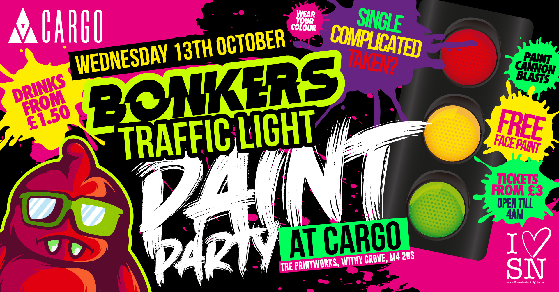 Bonkers Traffic Light Paint Party Drinks From 1 50 Rep Your Colour Paint Cannons Mardi Gras Beads 1600 Students At Cargo Manchester On 13th Oct 2021 Fatsoma